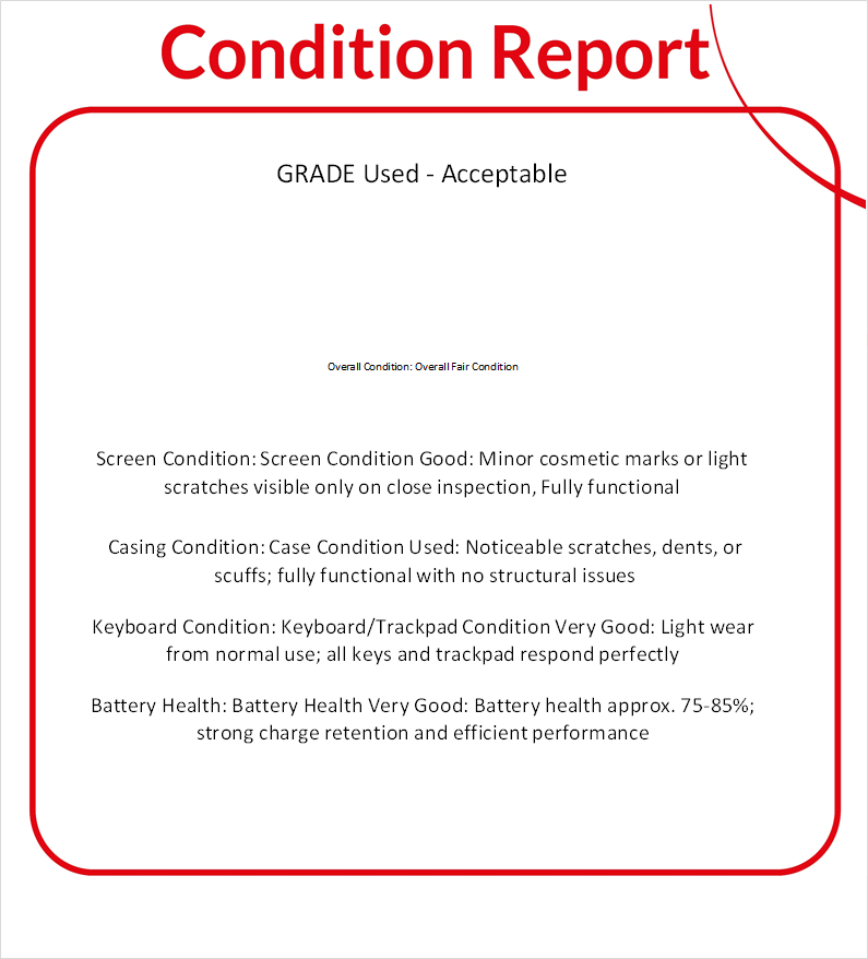 • Keyboard/Trackpad Condition Very Good: Light wear from normal use; all keys and trackpad respond perfectly