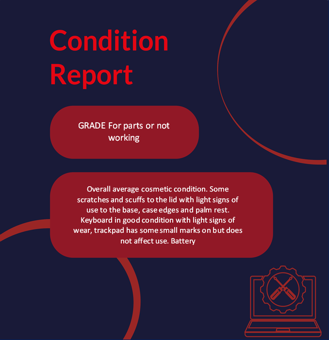 Damage Report: Overall average cosmetic condition. Some scratches and scuffs to the lid with light signs of use to the base, case edges and palm rest. Keyboard in good condition with light signs of wear, trackpad has some small marks on but does not affect use. Battery health approx. 90%. Network port hinge cover missing, network port still works. Laptop is BIOS LOCKED. Boot settings and other features cannot be changed. The laptop asks for a password on boot, the machine then has to be restarted using CTRL + ALT + DELETE where it will then boot into windows normally.