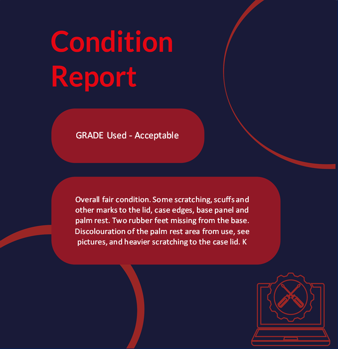 Condition Report: Overall fair condition. Some scratching, scuffs and other marks to the lid, case edges, base panel and palm rest. Two rubber feet missing from the base. Discolouration of the palm rest area from use, see pictures, and heavier scratching to the case lid. Keyboard and trackpad show signs of use and light wear. Screen in good condition and may show some light marks that do not affect use. Battery health approx. 40%, cycle count 480.